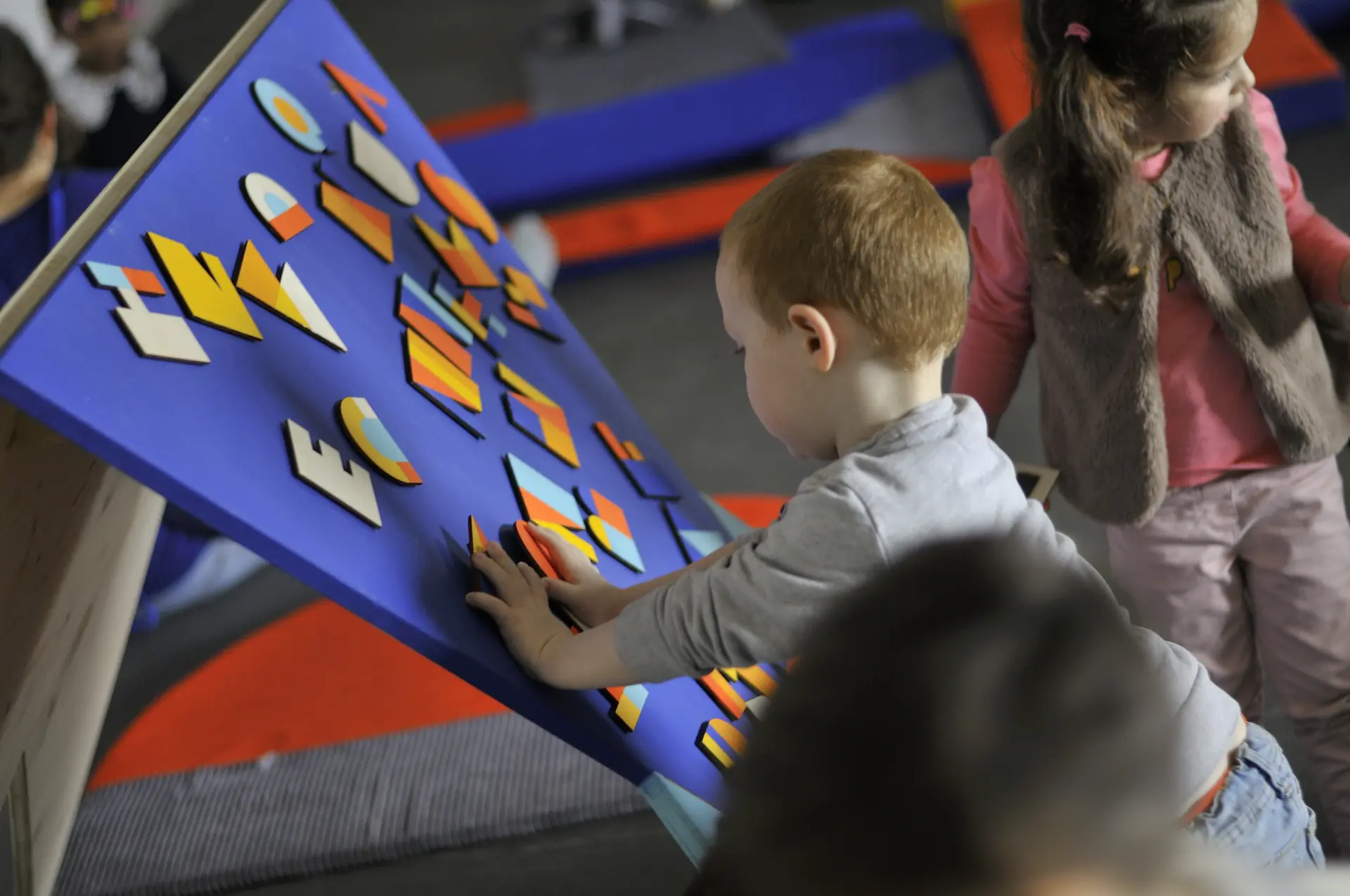 Alphabuleux est un espace d’émerveillement, un terrain d’exploration artistique qui invite les tou·te·s-petit·e·s (de 1 à 3 ans) à déambuler, découvrir, toucher, actionner, emboîter, composer et jouer avec de drôles de formes que nous, adultes, appelons lettres.