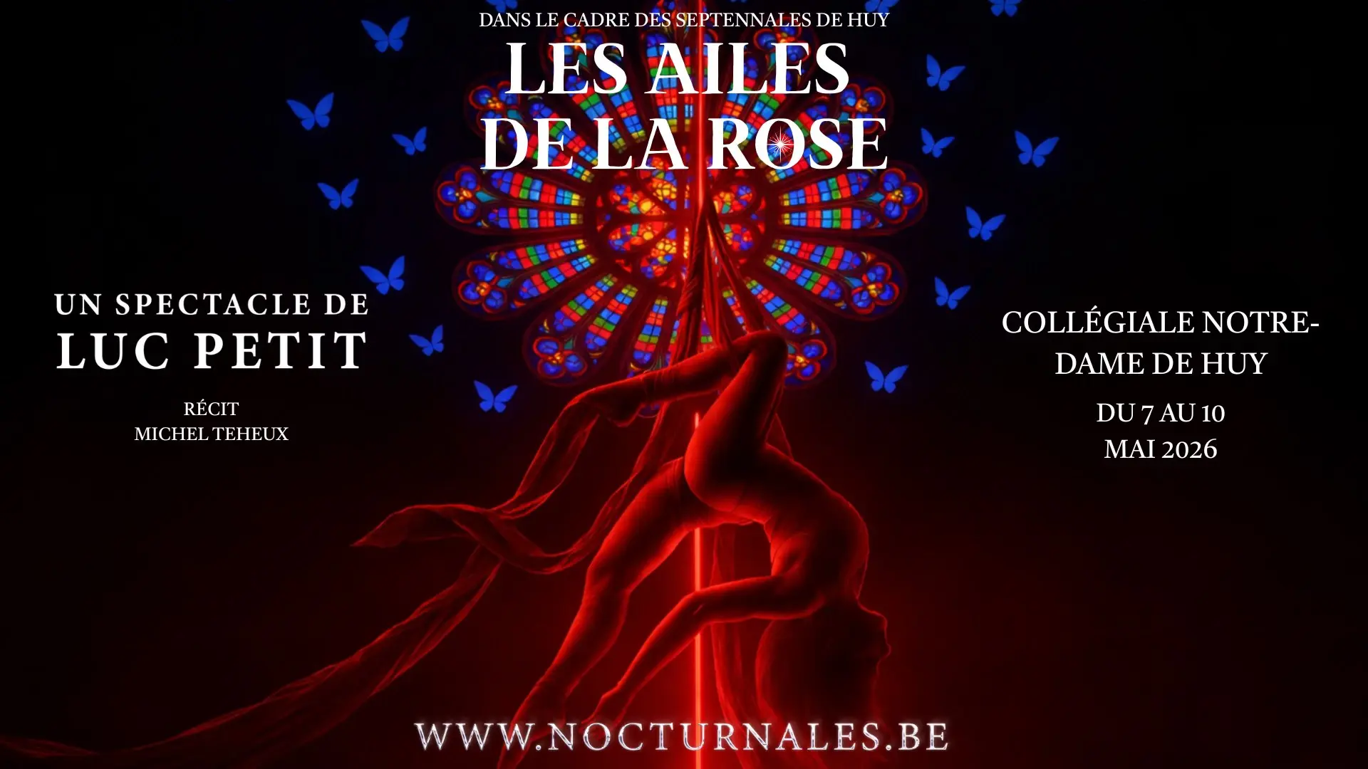 À l’occasion des Septennales de Huy, laissez-vous emporter par Les Ailes de la Rose, un spectacle monumental mis en scène par Luc Petit, du 7 au 10 mai 2026, au cœur de la majestueuse Collégiale Notre-Dame de Huy.