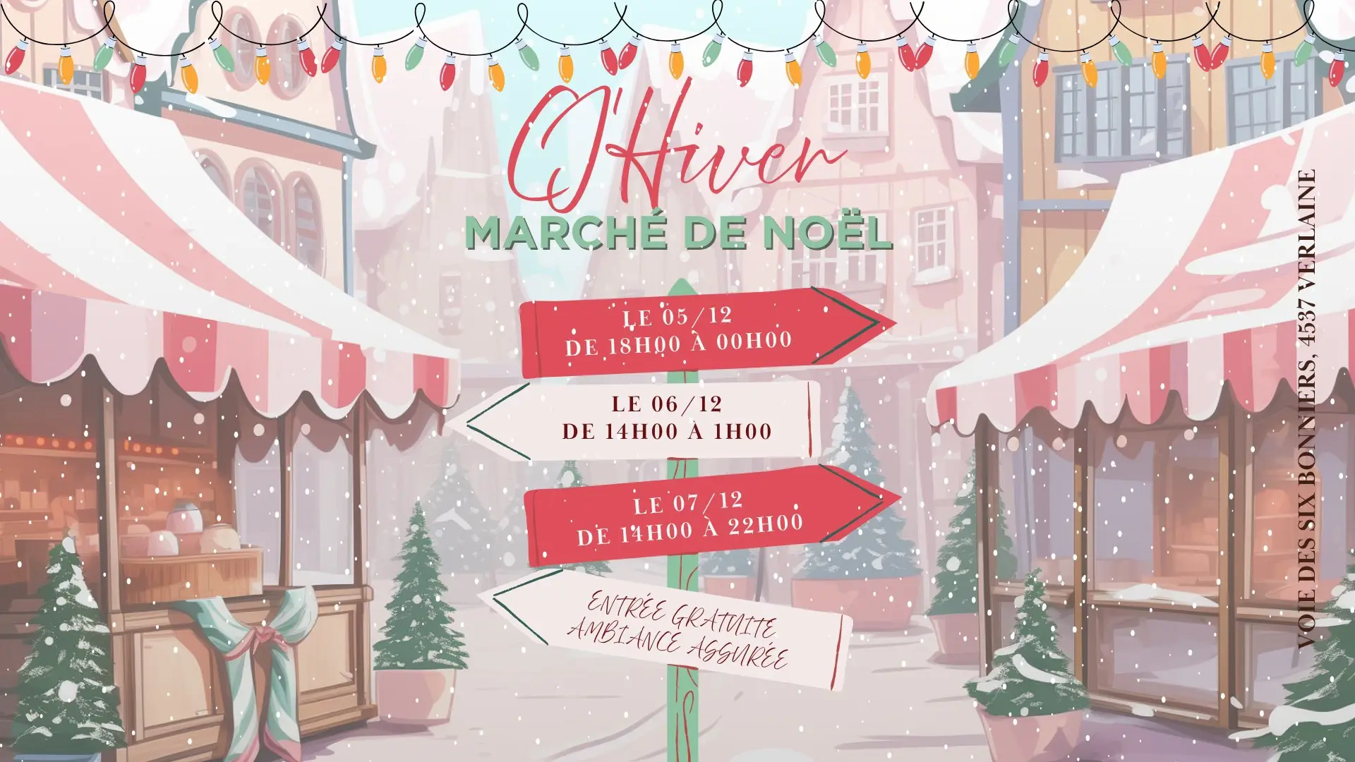 Après une super édition l’an passé, le marché d’hiver, sur le parking du foot à Verlaine, fait son grand retour ! Au programme, 16 chalets qui vous proposeront différents produits pour boire et manger.