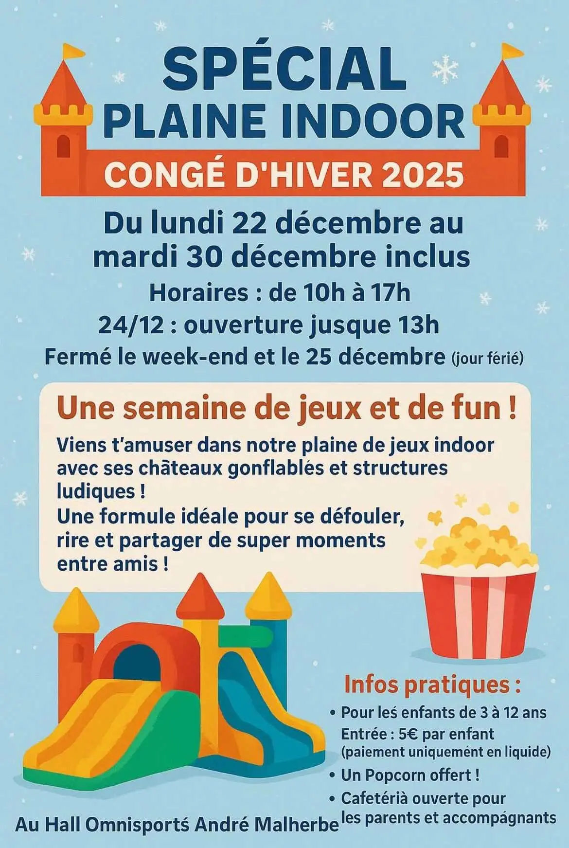 Venez profiter d’une semaine de jeux, de rires et de fun dans notre plaine de jeux indoor au Hall Omnisports André Malherbe !